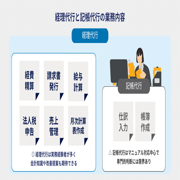 「経理代行」は、記帳代行の内容を内包しつつ、経費精算や請求書の発行、給与計算、売上管理などの実務も担います。月次・年次処理まで一貫してサポート可能なため、社内経理チームの代替としての機能を果たします。